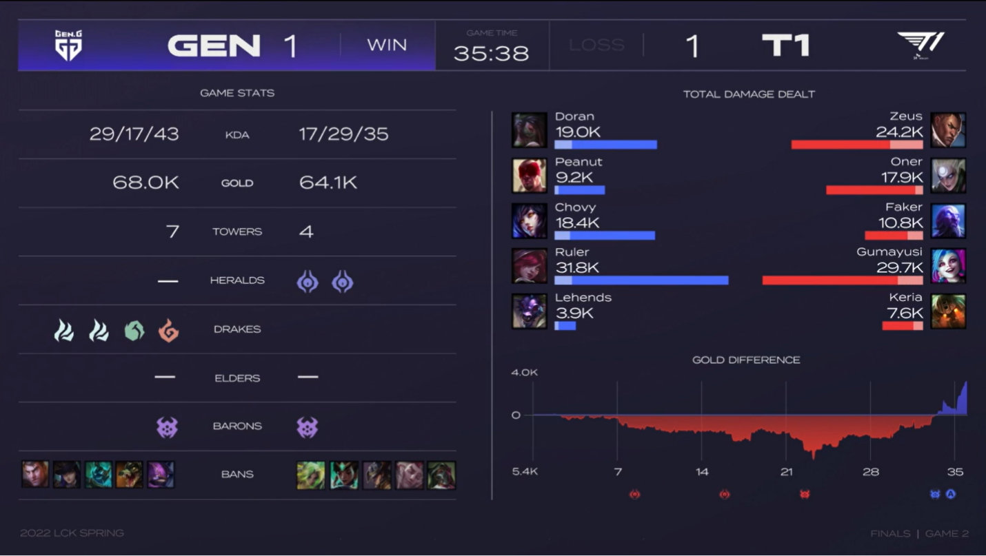 来到比赛,感觉T1今天手感不佳没有常规赛的统治力,但还是以三比一轻松战胜对手,在第一场比赛中,T1拿到熟悉的下路女警拉克丝阵容,轻松拿下;第二场比赛T1就遇到了GEN强力的反击,在GEN熟悉的阿狸霞双C的阵容,尽管T1前期拿到了优势还是被GEN拿到风龙魂翻盘成功。